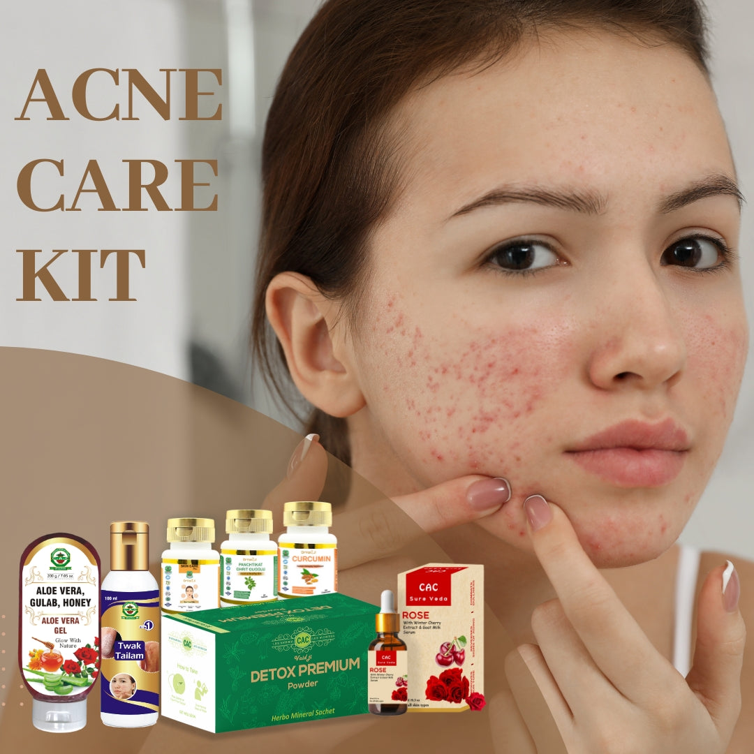 Acne is a skin condition in which there occur eruptions on skin due to blockage of hair follicles with oil and dead skin cells. Acne is very common among teenagers but it can affect people of all ages. Acne is of various types depending on the type of eruptions. It most commonly appears on face, chest, forehead, upper back and shoulders. In Ayurveda, acne occurs because of the aggravation of pitta dosha. It further leads to vitiation of the rakta and mamsa dhatu. This leads to eruptions on skin known as pimples or yauvana pidika. When the pitta dosha gets balanced, this relieves acne. In Ayurveda, there are various herbs which are used for treating acne such as nimba, haridra, manjishtha, etc. Dr Vaid Ji Acne Care Kit is very helpful in the management of acne and helps in getting rid of this skin problem without any side effects in the skin.