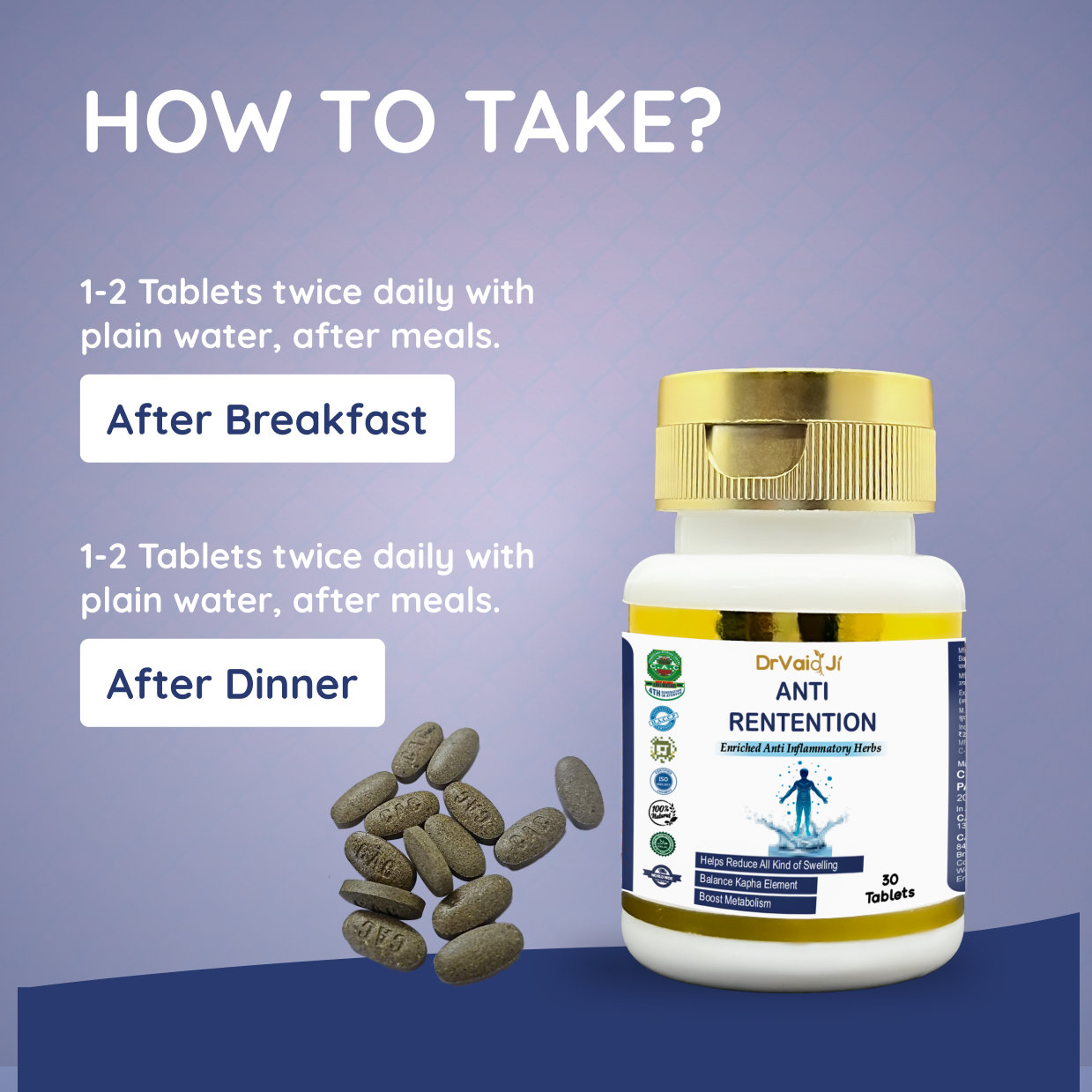 Dr Vaid Ji Anti Retention tablet is a healthy blend of many herbs. This tablet formulated to balance Kapha doshas without aggravating Pitta and Vata doshas. It can also be used to alleviate any temporary Kapha imbalance. It is very effective in Kapha season that is late winter and spring. It consists of warming and astringent herbs that help to balance the system throughout the cold season. The main use of Kapha tablets is to remove excess Kapha doshas from the system reduce any kind of body inflammation and helps in the management of weight, healthy lungs, and the immune system.