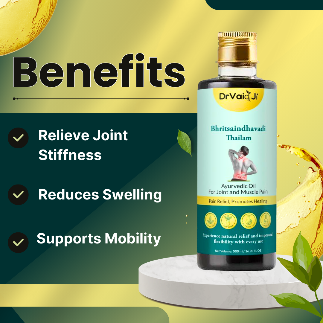 Dr Vaid Ji Brihata Saindhavadi Thailam is a classical Ayurvedic medicated oil formulated primarily for external application to alleviate pain, stiffness, and neurological disorders. The oil is named after its key ingredient, Saindhava Lavana (Rock Salt), known for its deep penetrating and Vata-balancing properties. The formulation also includes herbs like Dashamoola (a group of ten roots), Bilva (Aegle marmelos), Agnimantha (Clerodendrum phlomidis), and Sesame oil as the base. It is widely used in Panchakarma therapies, especially in conditions caused by Vata and Kapha imbalances.