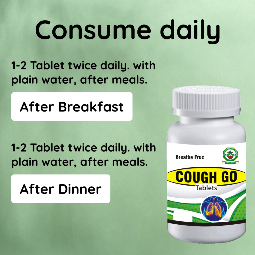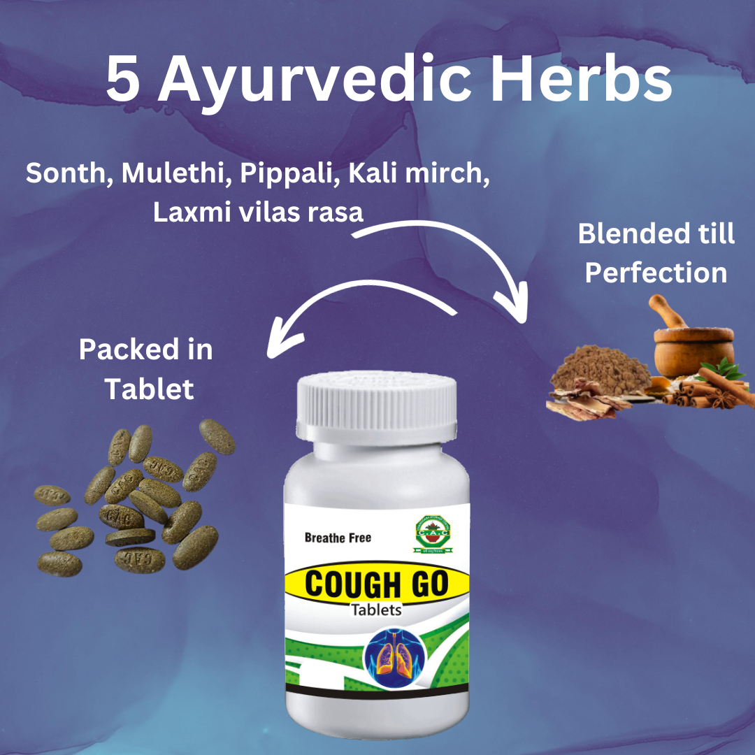 Dr.Vaid Ji COUGH GO TAB is a herbo-mineral tablet of size 650 MG and is a purely ayurvedic formulation. CAC Cough Go tablets help in balancing the kapha dosha. It shows effective results in Chronic Cough, common cold, and all respiratory diseases along with Seasonal Allergy, Bronchitis, Bronchial Asthma. It helps to treat root cause and also increase immunity of the person. Its not only symptomatic treatment but heals your body naturally. It contains pure herbal ingredients like Sonth (Zingiber officinale), Mulethi (Glycyrrhiza glabra), Pippali (Piper longum), Kali mirch (Piper nigrum), Laxmi vilas rasa, Abhrak bhasam, Tankan bhasam etc. These ingredients contain natural Kapha doshahar properties and help in curing all respiratory diseases and diseases related to Kapha dosha.