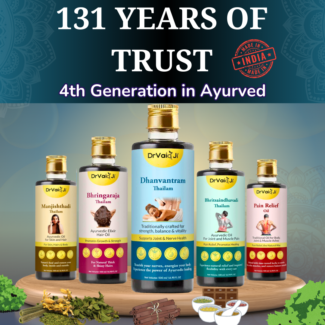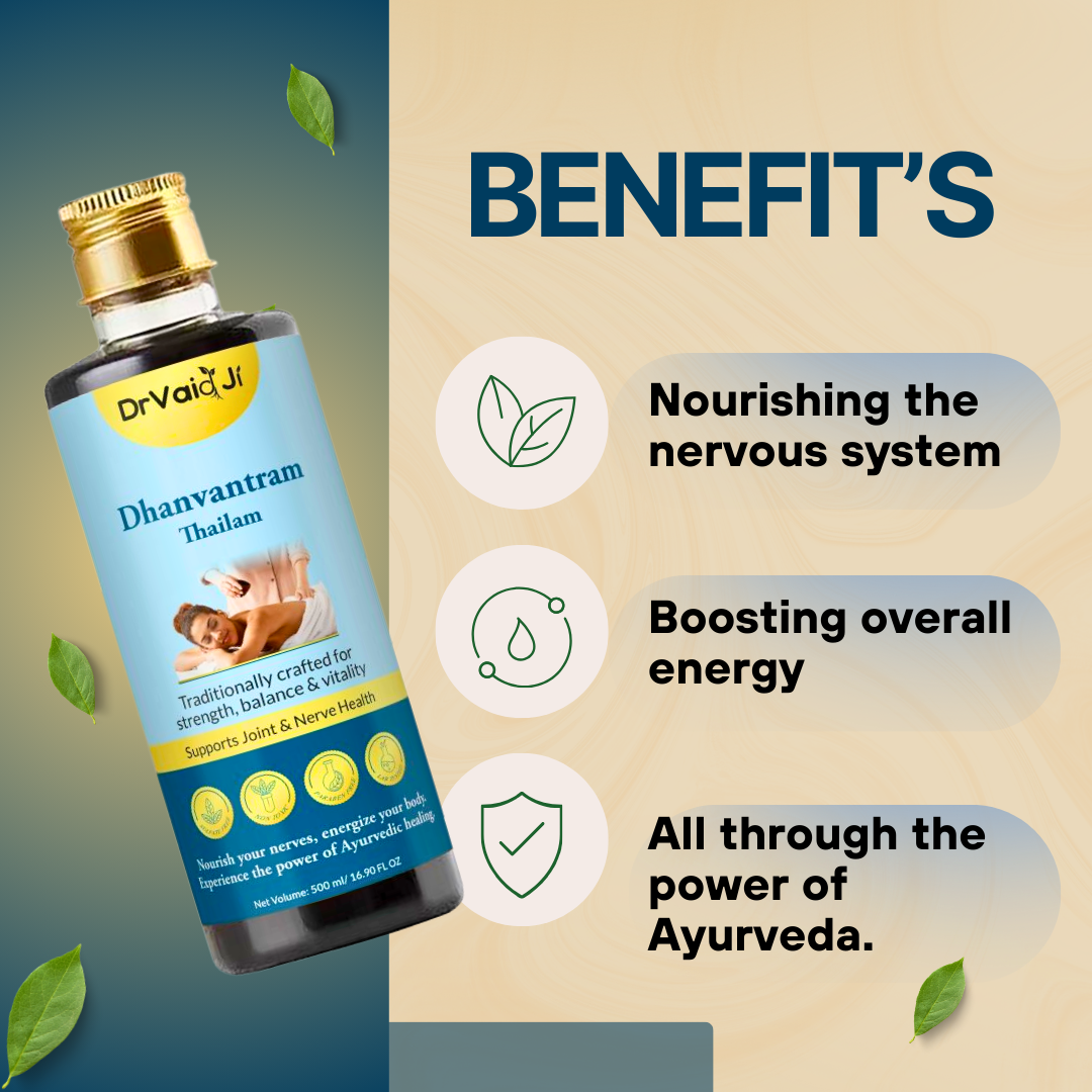 Dr Vaid Ji Dhanvantram Tail is a classical Ayurvedic medicinal oil named after Lord Dhanvantri, the divine healer. It is widely used for neuromuscular disorders, joint pain, and postnatal care, following the principles of Ayurveda to restore balance and vitality. Prepared from a blend of potent herbs like Bala (Sida cordifolia), Ashwagandha, Dasamoola, Agnimantha, and Shatavari in a base of sesame oil, it nourishes the muscles, strengthens bones, and supports nervous system health. Traditionally, Dhanvantram Tail is used in Abhyanga (Ayurvedic oil massage) to relieve stiffness, inflammation, and weakness in the body. It is especially beneficial for Vata disorders such as arthritis, back pain, paralysis, sciatica, and muscle wasting. The oil deeply penetrates the skin, improves blood circulation, and provides a calming, grounding effect on the body and mind. In postnatal care, it helps mothers regain muscle strength, reduce joint pain, and enhance overall recovery. Regular massage with warm Dhanvantram Tail promotes flexibility, reduces fatigue, and prevents degenerative changes in joints and tissues. Free from synthetic chemicals, this oil offers a safe, holistic, and time-tested approach to pain relief, nerve strengthening, and body rejuvenation, making it an essential part of Ayurvedic therapeutic care and daily wellness rituals.