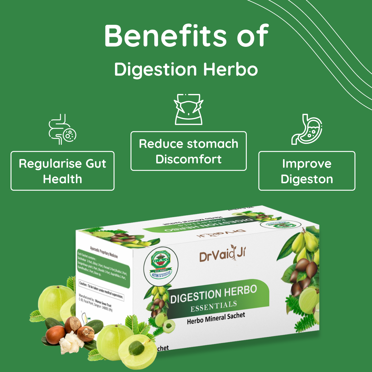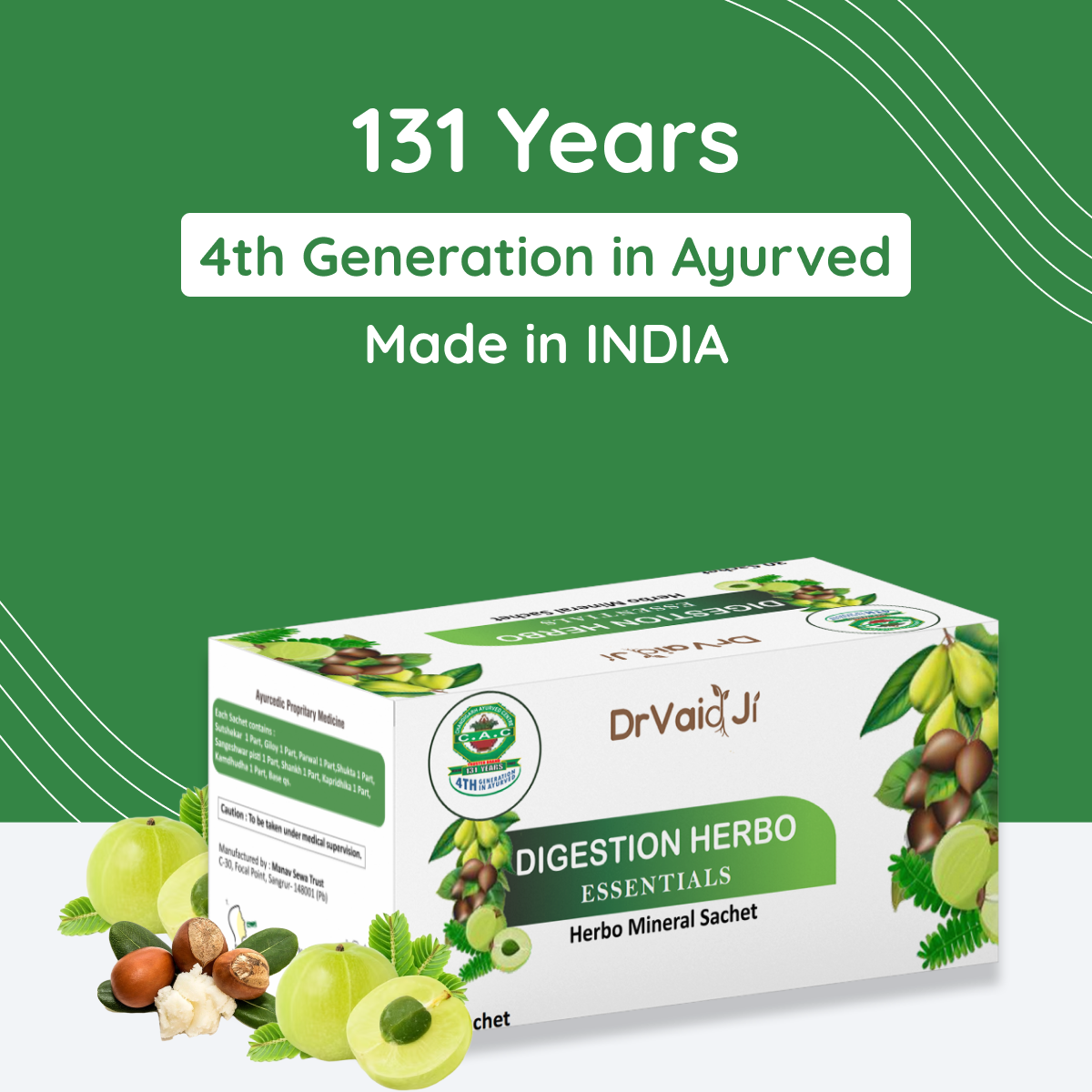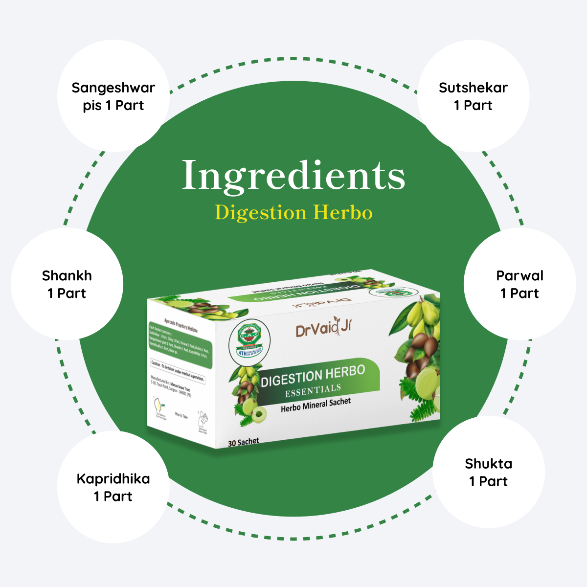 Dr.Vaid Ji Digestion Herbo Essentials is a unique blend of best digestive herbs like kutaj chal, bilav, dhania, mustak, shankh bhasm, pepper mint and dadim that maintain natural Ph balance in the stomach and aid digestion of all types of food. The herbs present in this control acidity, gas, flatulence and constipation. These all complex problems are root cause of all diseases. If digestive system is proper it leads to proper assimilation of the nutrients in the body.
