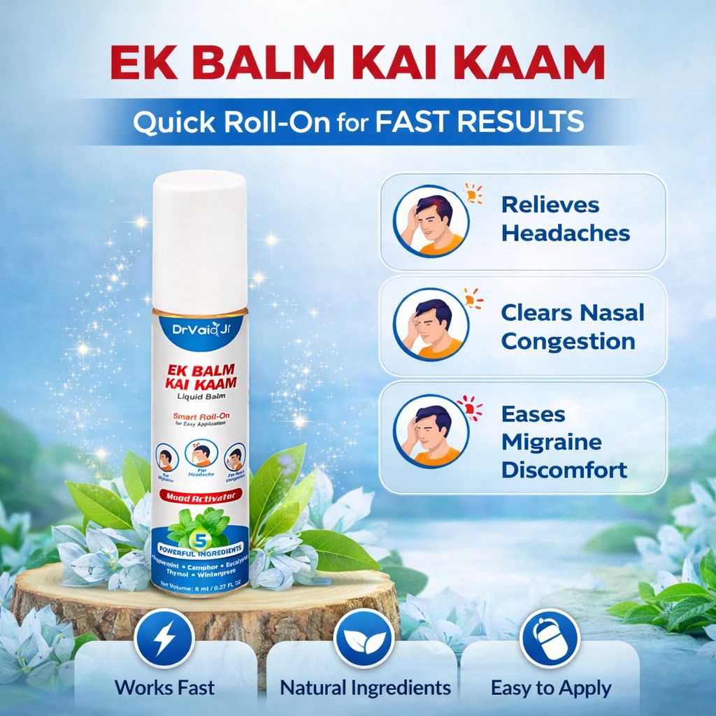 Dr Vaid Ji liquid balm is a natural remedy used to relieve headache, nasal congestion, and migraine. It is typically made from a blend of herbal oils such as eucalyptus, camphor, peppermint, clove, and ajwain, which possess strong anti-inflammatory, analgesic, and decongestant properties. When applied to the forehead, temples, or chest, the balm provides a soothing and cooling sensation that helps ease tension and enhances blood circulation. The vapors from the balm help clear blocked nasal passages, offering quick relief from sinus-related headaches and cold symptoms. For migraine sufferers, the balm works by relaxing the nerves, calming the mind, and reducing throbbing pain. Being non-toxic and free from harmful chemicals, Ayurvedic liquid balm is safe for regular use. Its aromatic herbs not only provide symptomatic relief but also promote overall mental clarity and relaxation, making it a holistic solution for headache and respiratory discomfort.