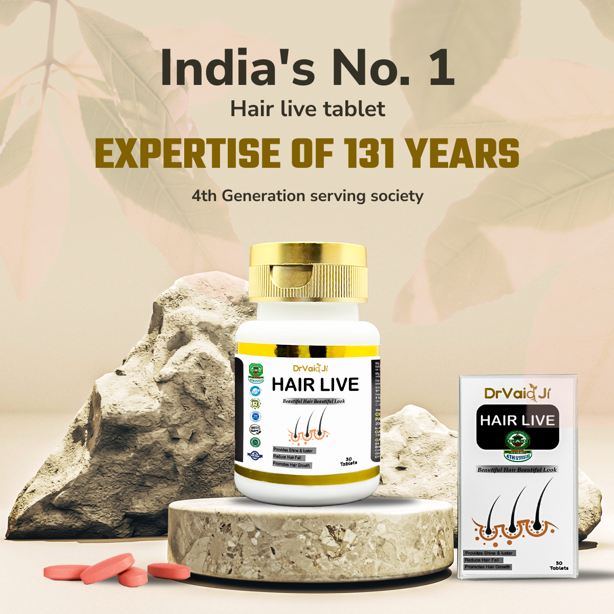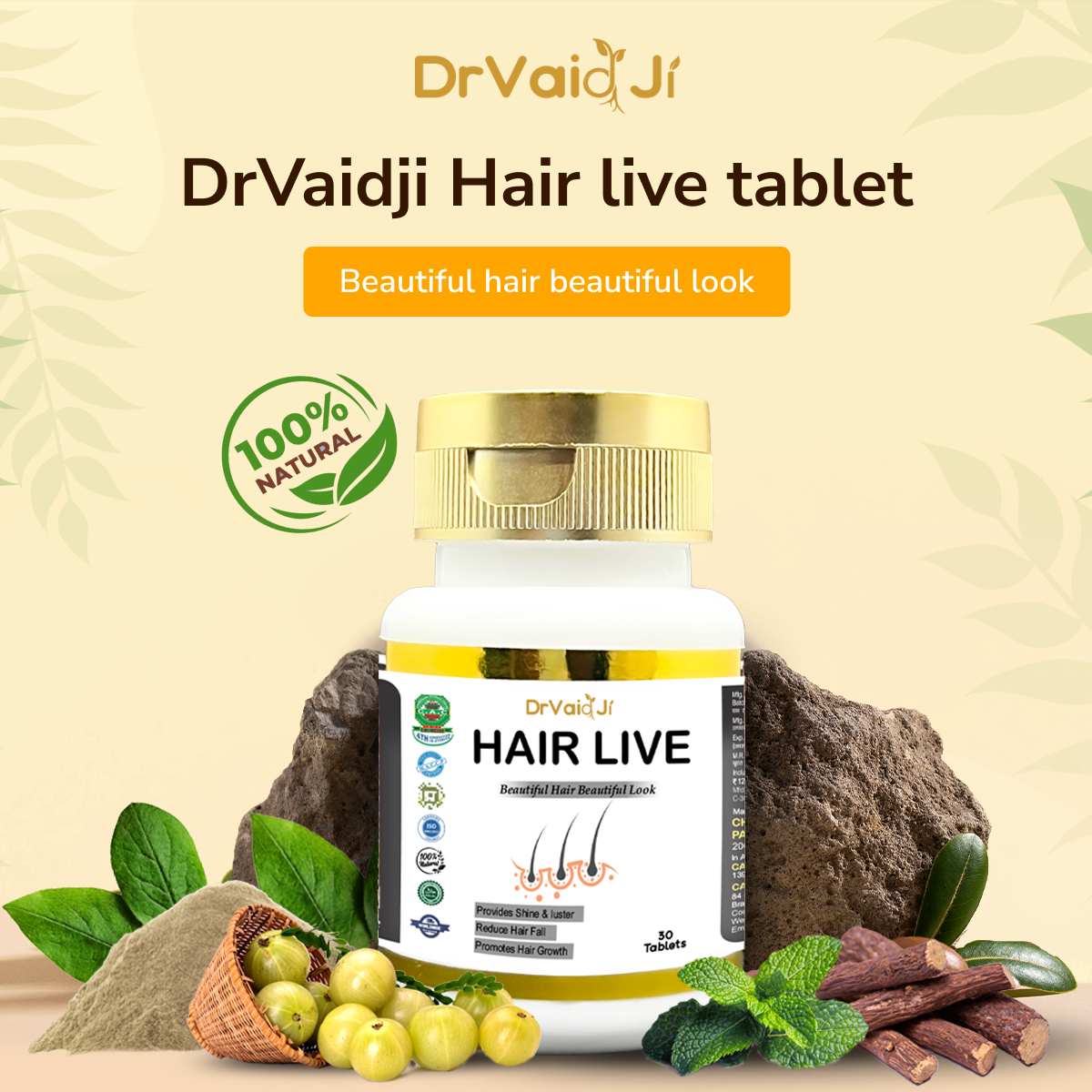 DrVaidJi Hair live tablet is a herbo and purely ayurvedic formulation. It works on tridoshas and maintains their imbalance. It contain various herbs like Bhringraj, Aamlaki, Mulethi , Dhatri lauh, Shudh gandhak and Brahmi that help in hair growth , prevent hairfall and greying of hairs, make hair strong, and make it shinier and healthy. This tablet also helps in rejuvinates memory, hair, teeth, bones, vision and hearing. This tablet is anti-oxidant, anti-viral, analgesic, anti-bacterial and hepato protective in nature. Dhatri lauh present in this tablet is an iron rich supplement that increases blood circulation in the scalp making your hair denser.It will strengthen your hair follicles and reduce hair fall.