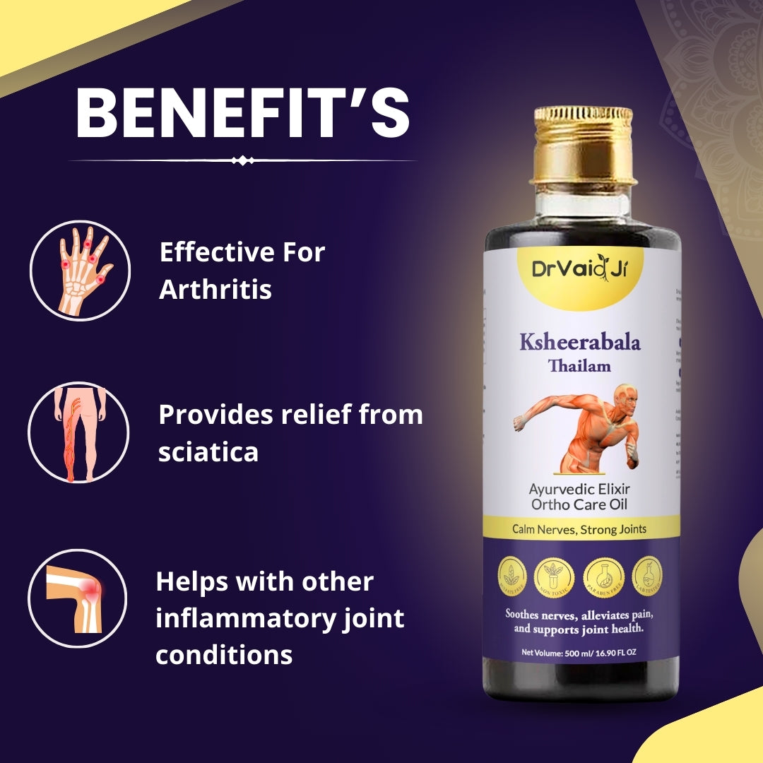 Dr Vaid Ji Ksheerabala Thailam is a classical Ayurvedic medicated oil formulated with just three main ingredients: Bala (Sida cordifolia), Ksheera (cow's milk), and Tila Taila (sesame oil). This unique combination offers nourishing, strengthening, and rejuvenating effects, making it especially useful in managing Vata disorders. It is widely used both externally and internally (as prescribed) in various Ayurvedic therapies for neurological and musculoskeletal conditions. The oil is known for its Balya (strengthening), Snigdha (unctuous), and Vatahara (Vata-pacifying) properties. It supports the health of the nervous system, bones, joints, and muscles while providing deep nourishment to tissues.