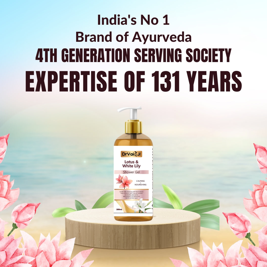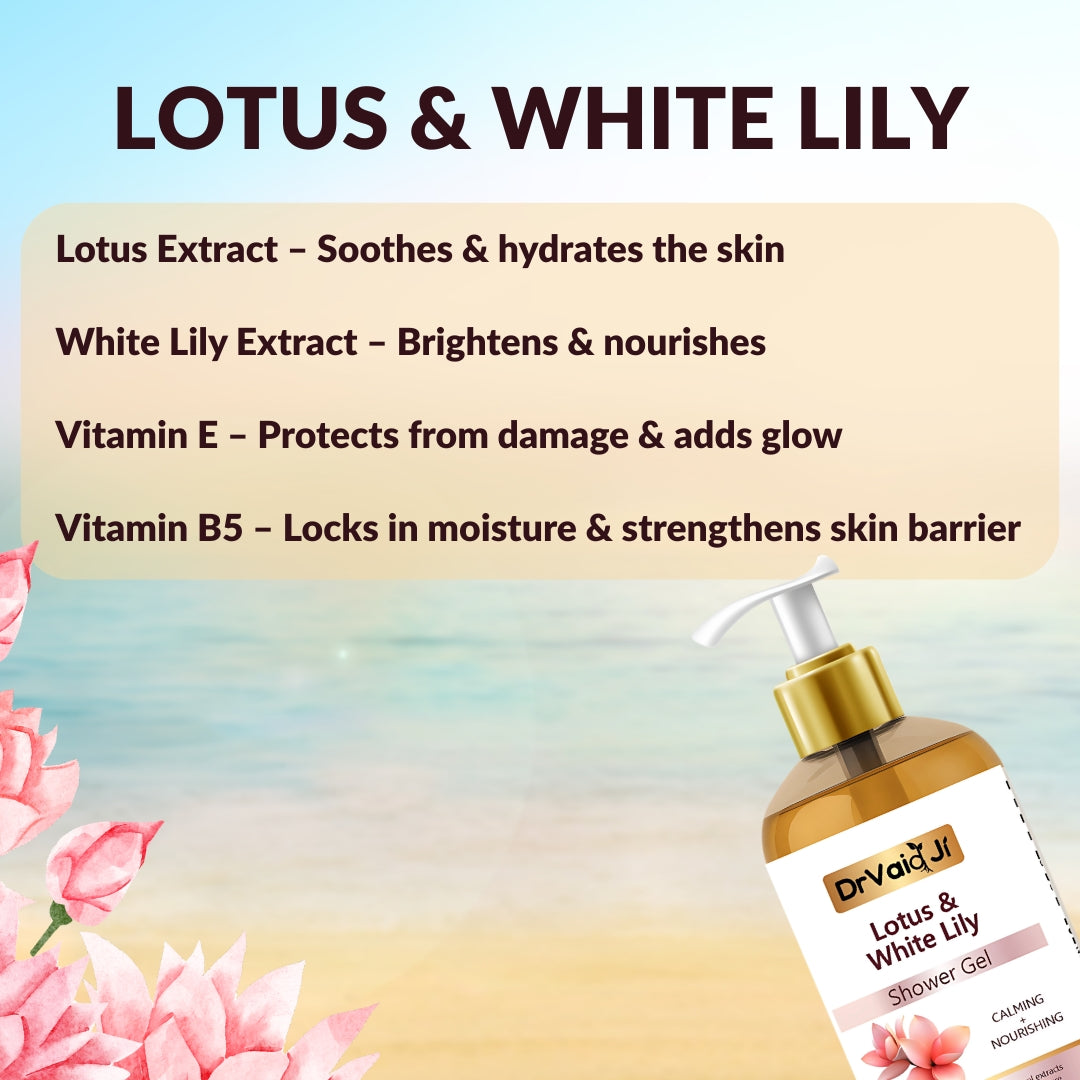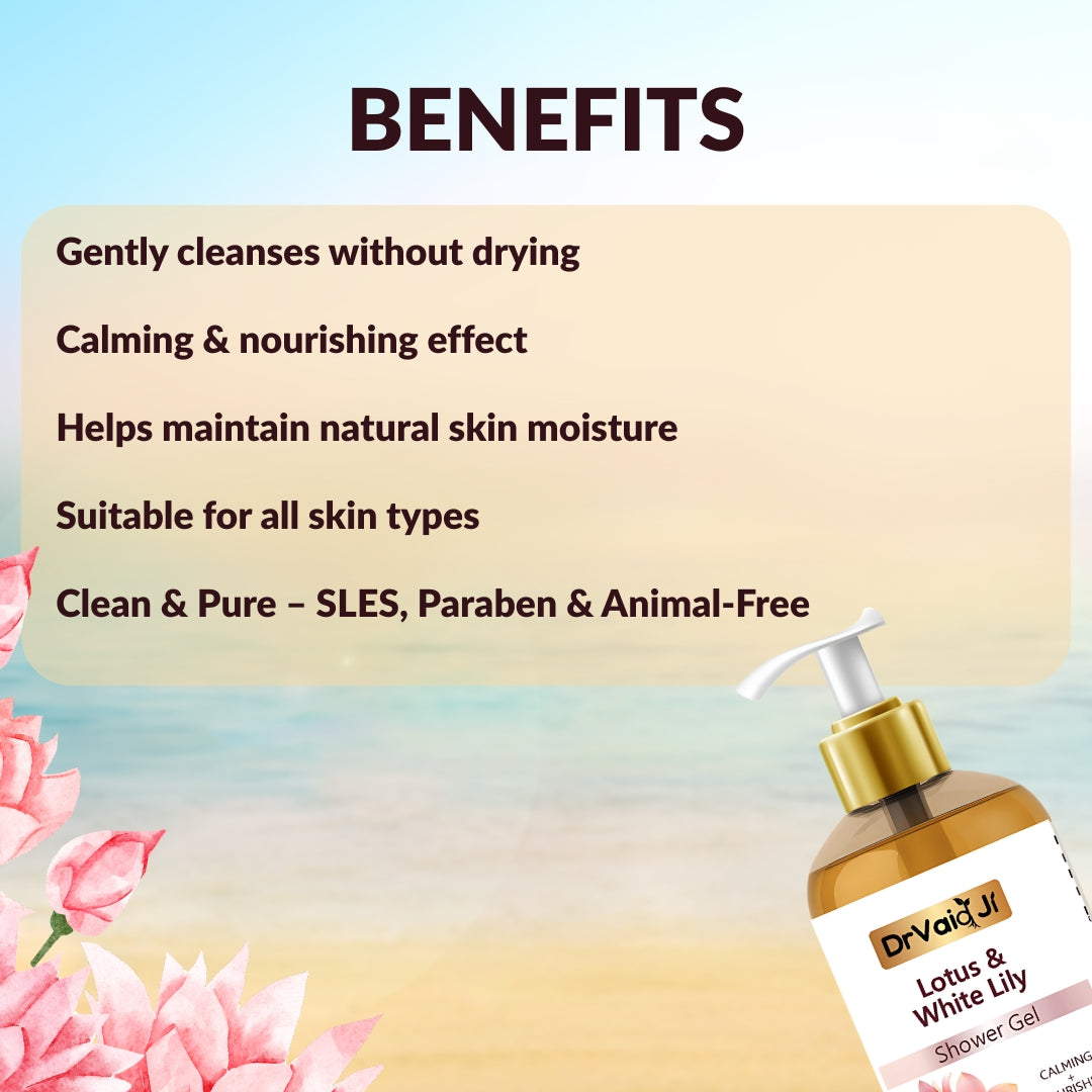 Dr.Vaid Ji Lotus and White Lily Shower Gel is a soothing body cleanser that combines the purity of lotus with the softness of white lily. Lotus is known for its cooling, purifying, and moisturizing qualities that help cleanse the skin gently while maintaining its natural hydration. White lily, on the other hand, nourishes deeply and brightens the skin, giving it a soft, radiant glow. Together, these floral extracts create a refreshing bathing experience that uplifts both body and mind. The gel forms a rich, mild lather that washes away dirt and excess oil without making the skin dry. Its subtle floral fragrance lingers on the body, leaving a calming and fresh feeling throughout the day. Suitable for all skin types, especially dry and sensitive skin, this shower gel makes daily bathing a rejuvenating ritual, keeping the skin hydrated, clean, and delicately fragrant.