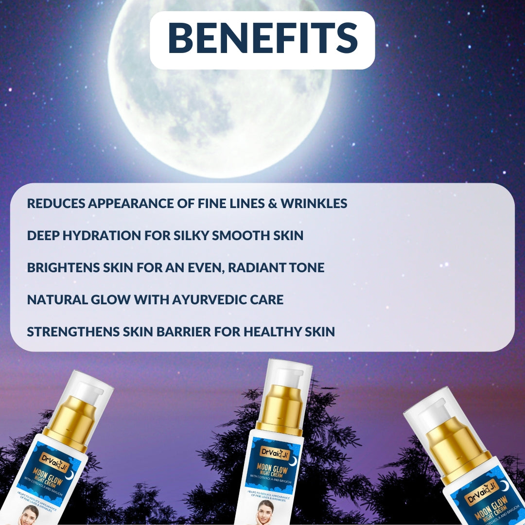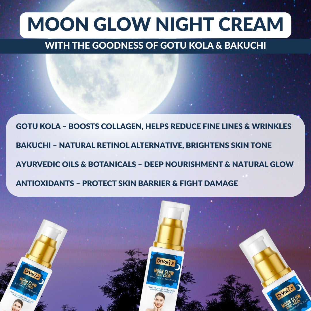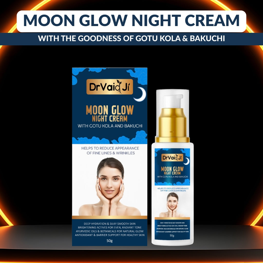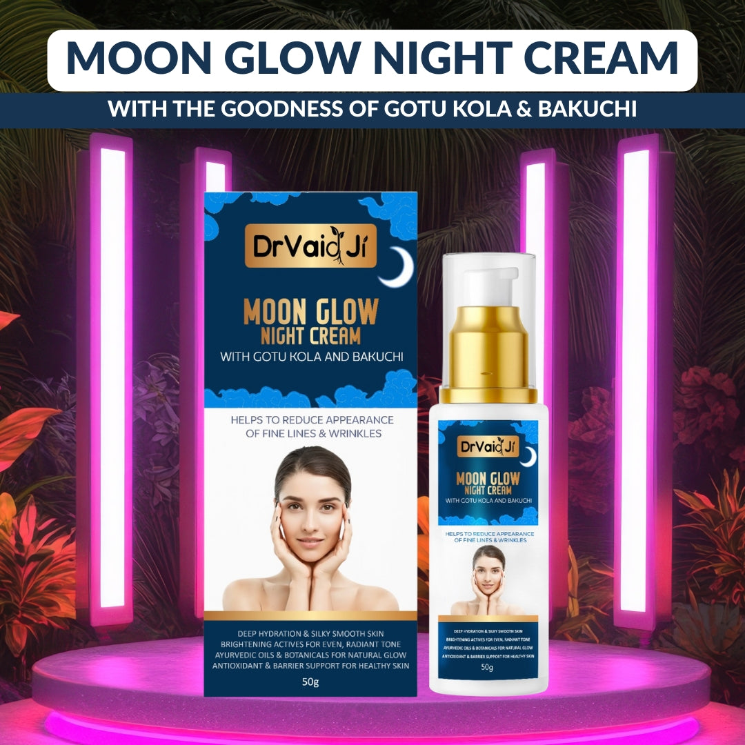 Moon Glow Night Cream is a luxurious Ayurvedic formulation enriched with the goodness of Gotu Kola and Bakuchi to rejuvenate your skin overnight. Gotu Kola, known for its powerful anti-aging and skin-repairing properties, helps boost collagen production, improves skin elasticity, and fades fine lines and wrinkles. Bakuchi, a natural source of bakuchiol (a gentle alternative to retinol), helps in reducing dark spots, pigmentation, and uneven skin tone while promoting radiant, youthful skin. This cream deeply nourishes and hydrates the skin, enhancing its natural glow and firmness. Regular use helps restore dull and tired skin, giving you a smooth, supple, and refreshed complexion every morning. Free from harsh chemicals and artificial fragrances, Moon Glow Night Cream is suitable for all skin types and works effectively to repair and renew skin cells while you sleep, revealing a brighter and more luminous appearance
