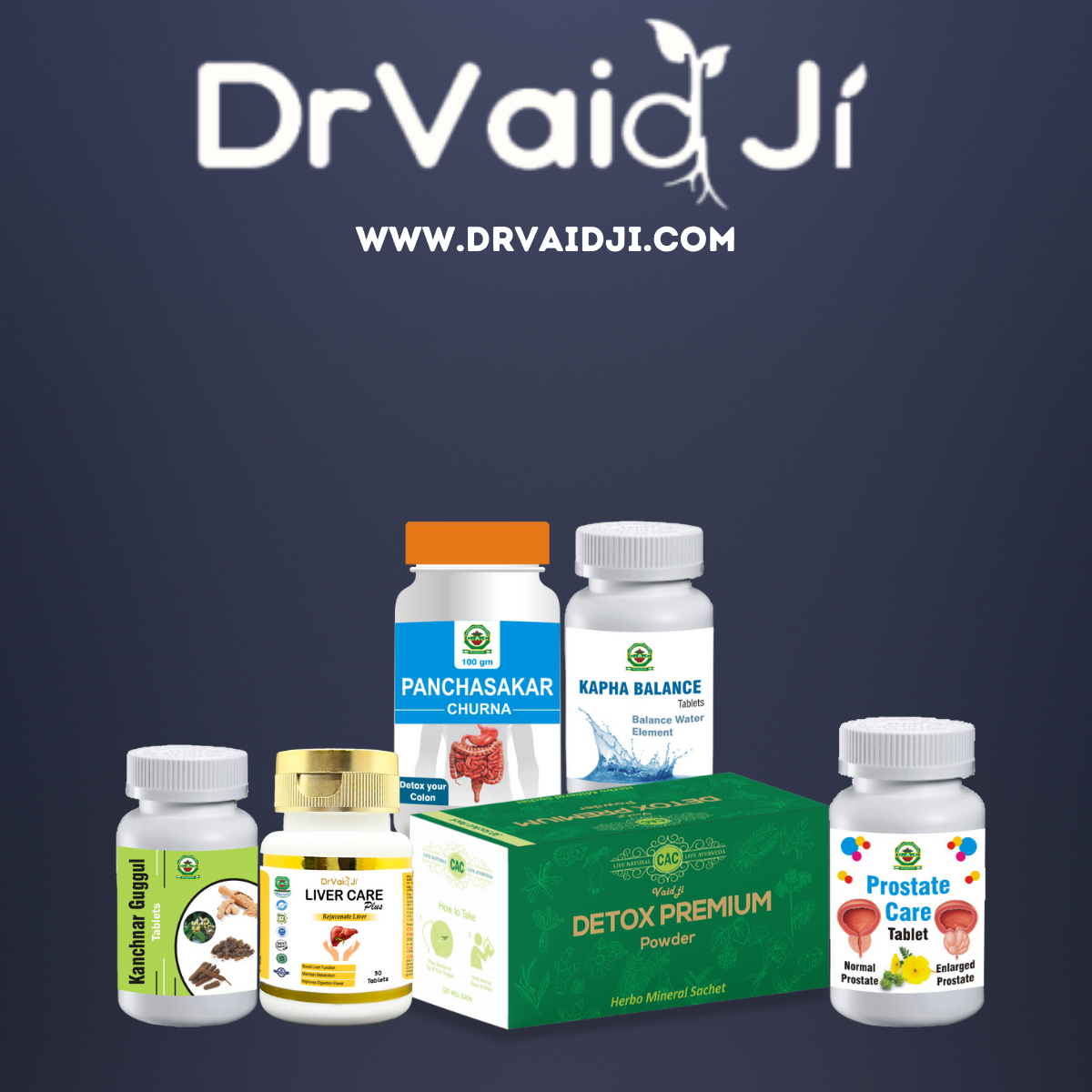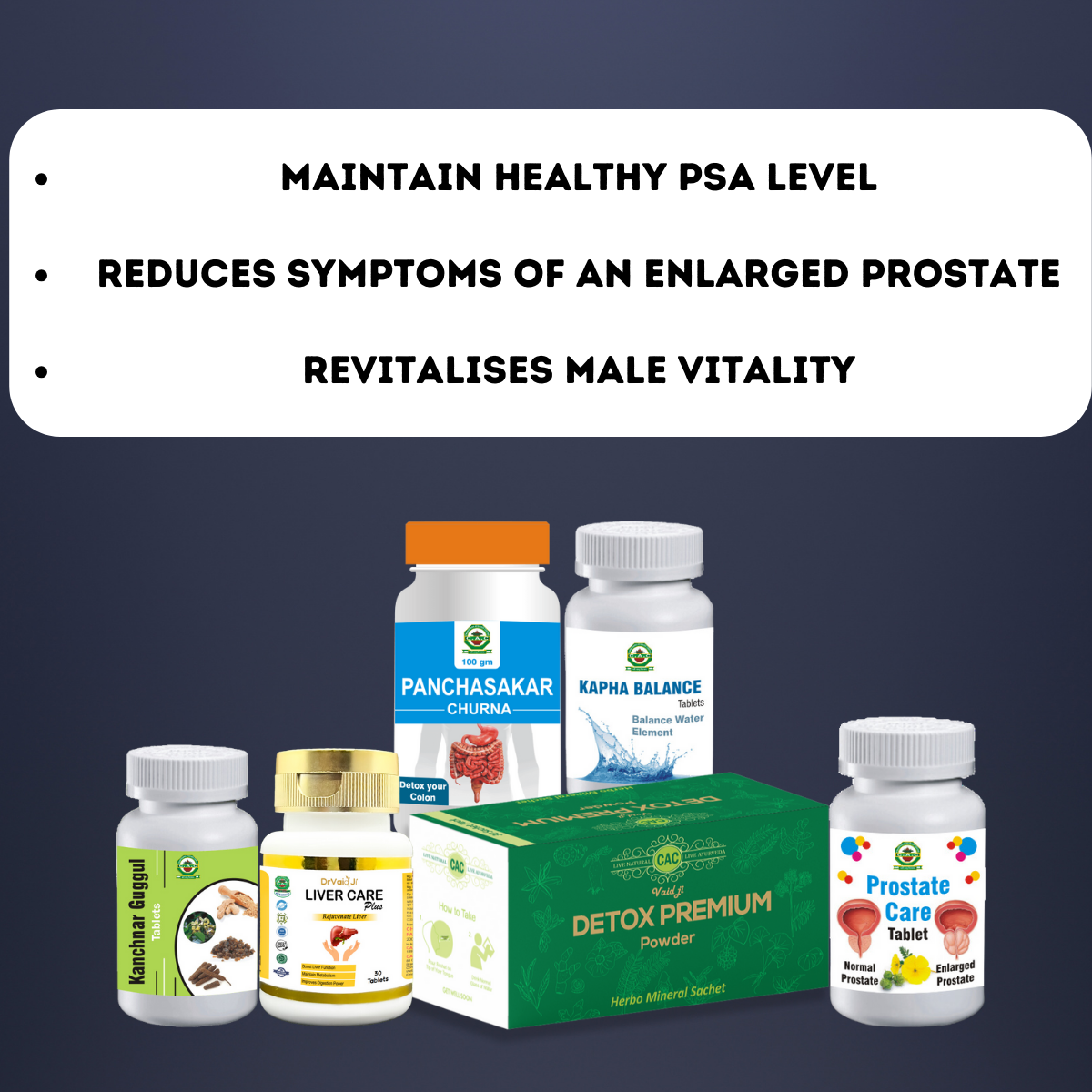 The prostate is defined as a walnut-sized gland located between the bladder and the penis. The urethra runs in between the center of the prostate from the bladder to the penis, letting urine flow out of the body. The main function of the gland is to secrete a fluid that nourishes and protects sperm. Dr Vaid Ji made a kit 'Prostate Care Kit', which includes herbal medicines and bhasmas and is proven to the best management of any disease of the prostate. The kit has a total of 6 products named as Kanchnaar guggulu, Detox premium powder, Trikatu syrup, Sheet dhara syrup, and Panchasakar churna..