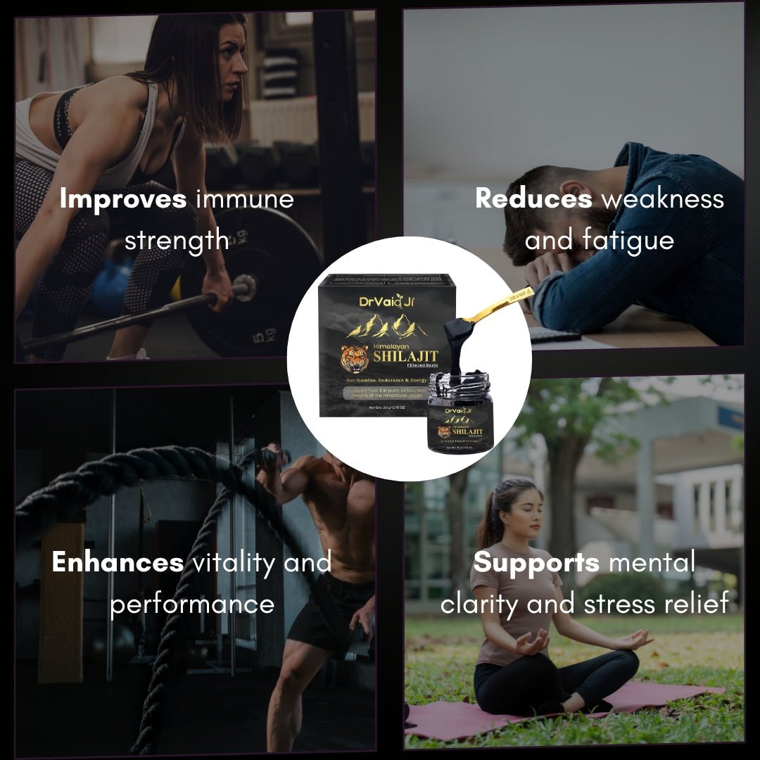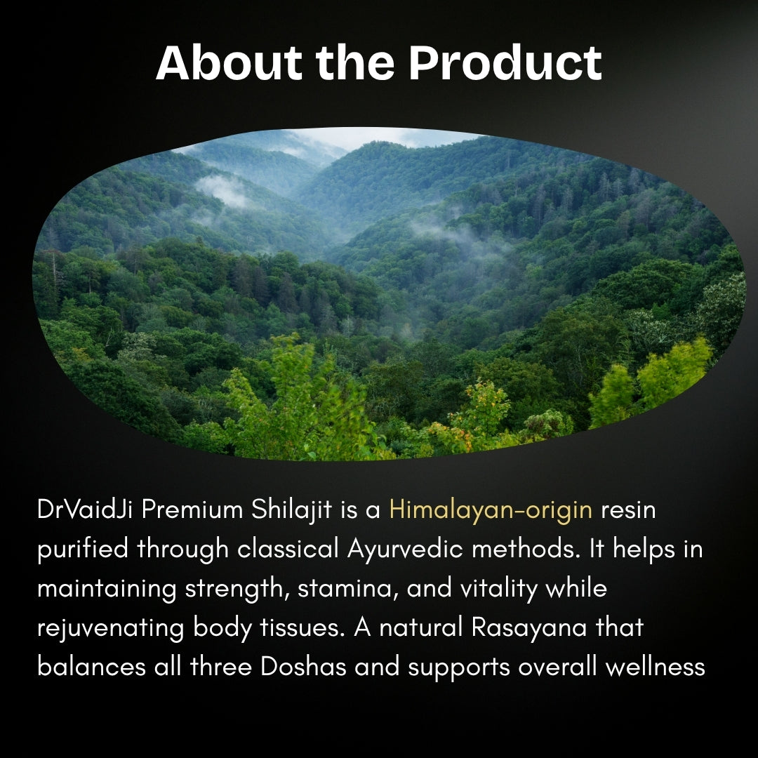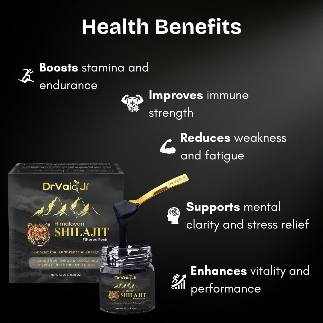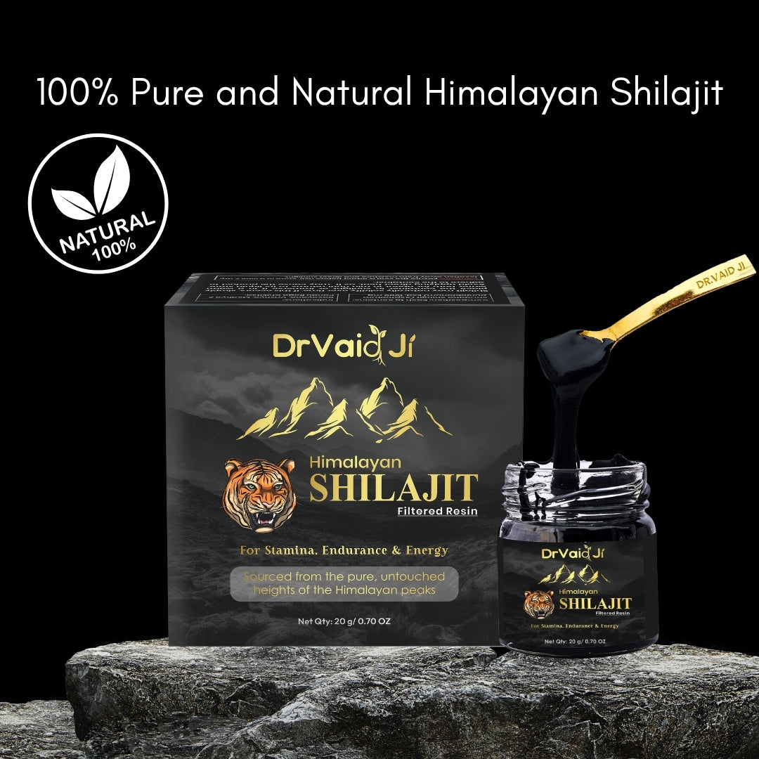 Dr Vaid Ji Himalayan Premium Shilajit is available in the form of Shilajit Satva. It is a potent Immunity Booster and acts as an antioxidant, possesses anti-inflammatory properties. It has a tremendous effect on Male Harmones, Anaemia, Alziehmers disease, improves brain functions, Fatigueness, various Tumours and Cysts like PCOD in females. Due to its anti-inflammatory properties it works on inflamed lymph nodes as well. It balances blood sugar, increases absorption of nutrients, helps in detoxification, helps in reducing mood swings.