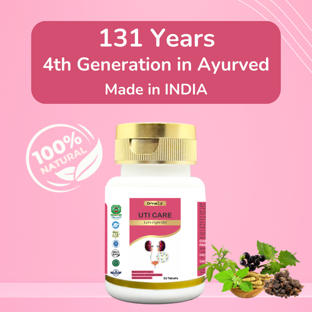 Dr.Vaid Ji UTI Care Tablet is a herbo-mineral tablet of 650 MG and is a purely ayurvedic formulation. CAC UTI Care tablets are 100% safe and natural. It helps to treat the root cause of disease naturally without having any side effects. UTI Care Tablets helps to treat Urinary tract infections along with the diseases related to kidney, ureters, urinary bladder, and urethra. This tablet contains pure herbal ingredients which are Yavakshar (Hordeum vulgare), kalmi Shora (Pottasium nitrate), Naushadar (Ammonium chloride), Swarna Gairik (Red ochre), etc. UTI Care Tablets are also beneficial in kidney stones, chronic kidney disease, Renal colic, burning sensation or pain during micturition, Hypertension.